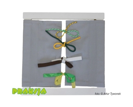 - Ramka z zapięciami sznurowanymi służąca do ćwiczeń z zakresu motoryki małej.