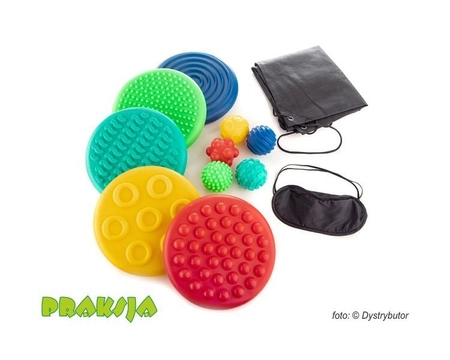To zestaw pięciu dysków i pięciu piłeczek fakturowych. W zestawie znajduje się również opaska na oczy i worek.