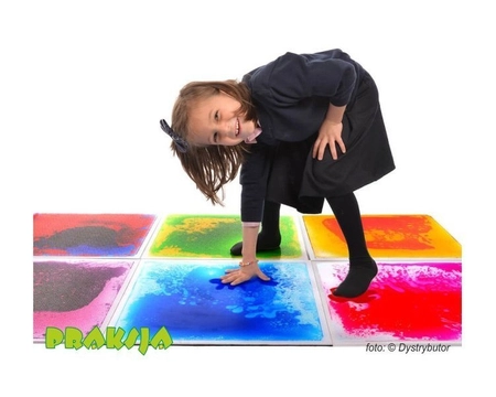 Zestaw 6 sensorycznych paneli z bezbarwnego, elastycznego tworzywa wypełnionych gęstymi barwnymi płynami, które pod naciskiem tworzą fantazyjne, kolorowe wzory. Płyn jest bezpieczny i nietoksyczny. Panele sensoryczny to znakomity dodatek do sal zabaw, przedszkola czy sal doświadczania świata. Wytrzymałe płytki sensoryczne umożliwiają świetną zabawę, dzieci mogą po nich chodzić, tańczyć i naciskać płytki, które to zmieniają raz po raz swoje wzory. Sensoryczne płytki dotykowe pobudzają wyobraźnię i zachęcają dzieci do zabawy. Rozwijają ciekawość oraz stanowią interesujący przyrząd do integracji sensorycznej, który pozwala dziecku się wyciszyć.