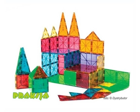Zestaw 104 klocków magnetycznych w fornie płytek o regularnych, geometrycznych kształtach. Pozwalają one na stworzenie niesamowitych budowli.